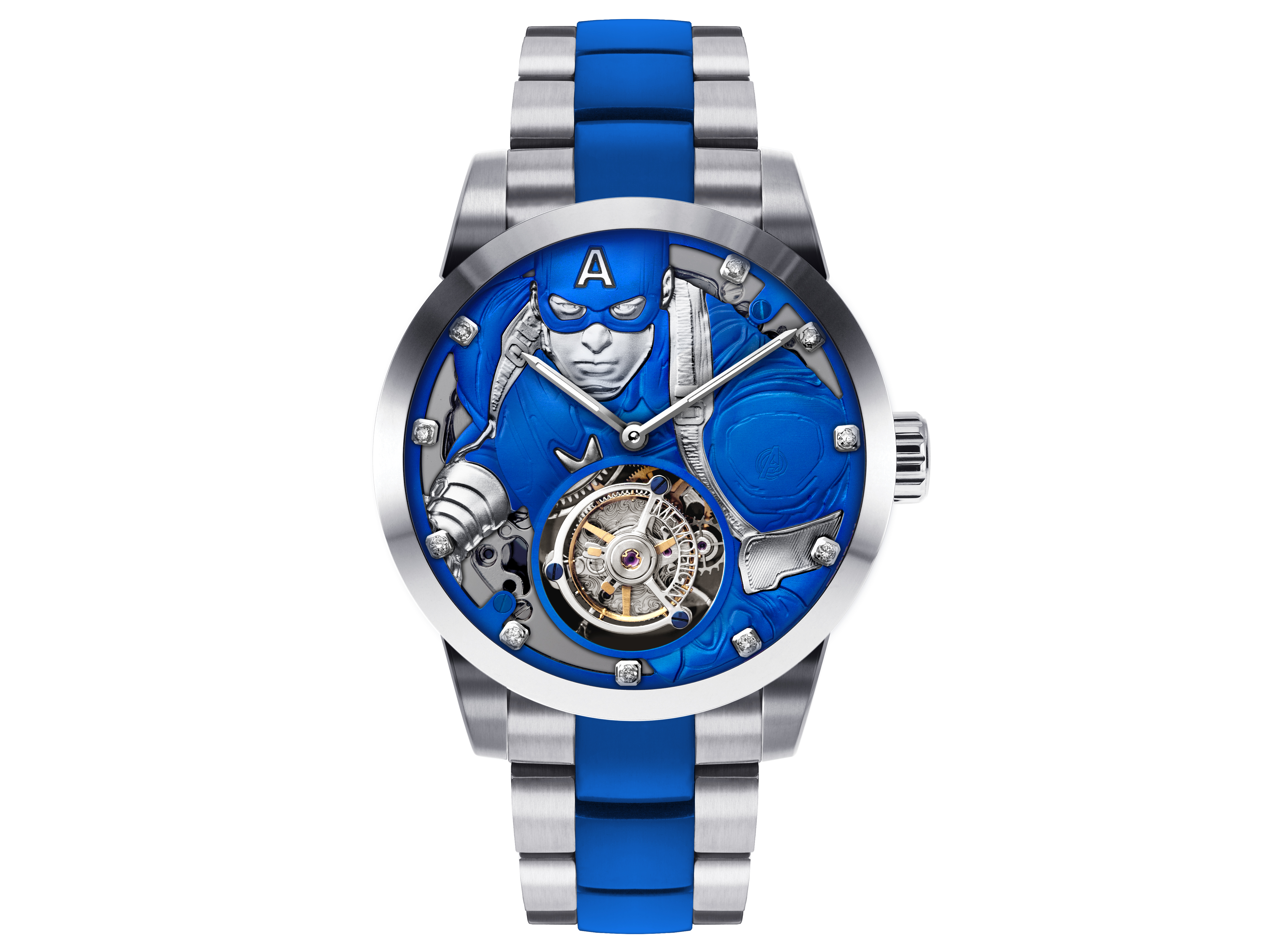 復仇者聯盟2系列 – 美國隊長 手表型號:MV 0423 手表直徑:43毫米 手表厚度:13毫米 155件組件及18顆寶石承軸 振頻: 28800次/每小時 6時位陀飛輪每轉一圈60秒 40小時動力儲存 飛行陀飛輪 鏤空機芯表面 美國隊長造型浮雕 表面鑲嵌10顆鑽石作時間刻度 鍍藍色不鏽鋼表帶 藍寶石玻璃表面及底蓋