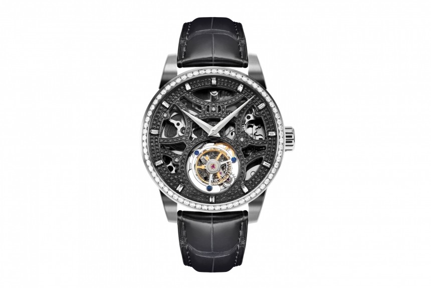 手表型號:ST 0821 白鑽 98粒,約重1.09克拉 黑鑽 273粒, 約重1.11克拉 155件組件及18顆寶石承軸 振頻:28800次/每小時 6時位陀飛輪每轉一圈60秒 擺輪及擒縱機構同時圍繞擺輪中心 飛行陀飛輪 40小時動力儲存 鱷魚皮表帶 藍寶石玻璃 條碼 : 4894379222684